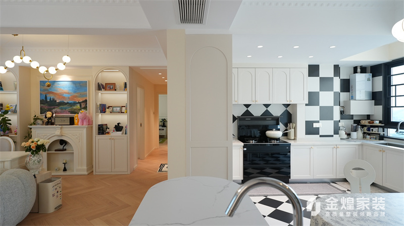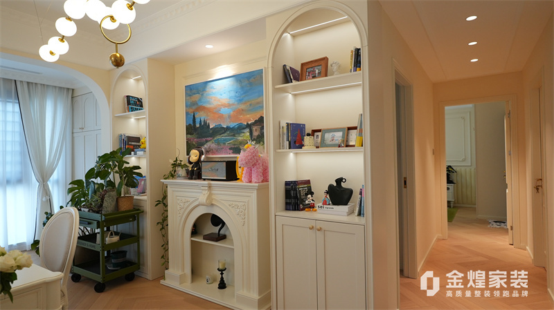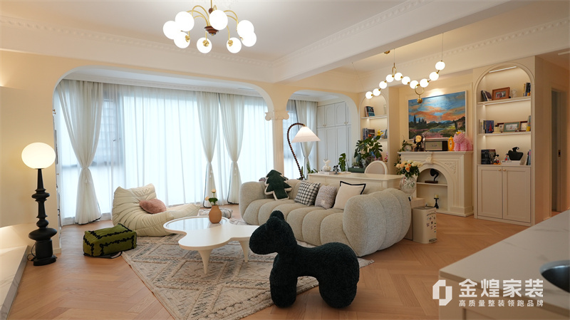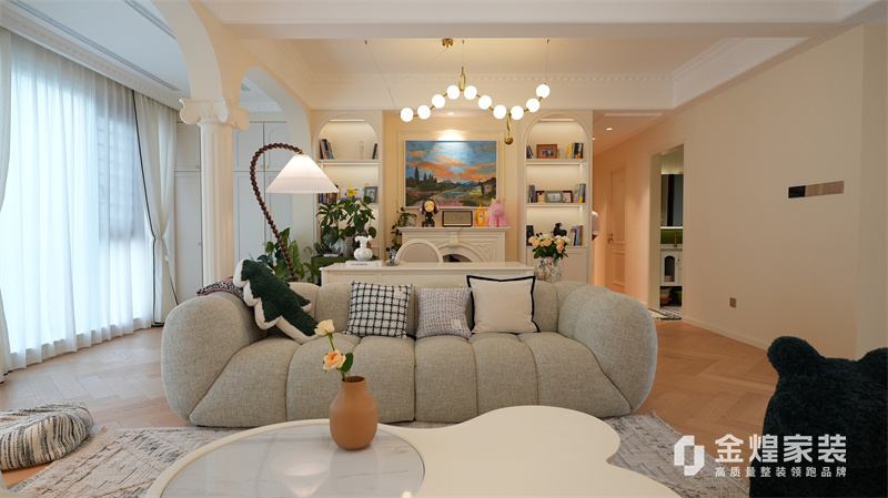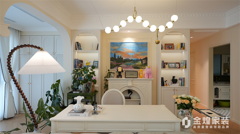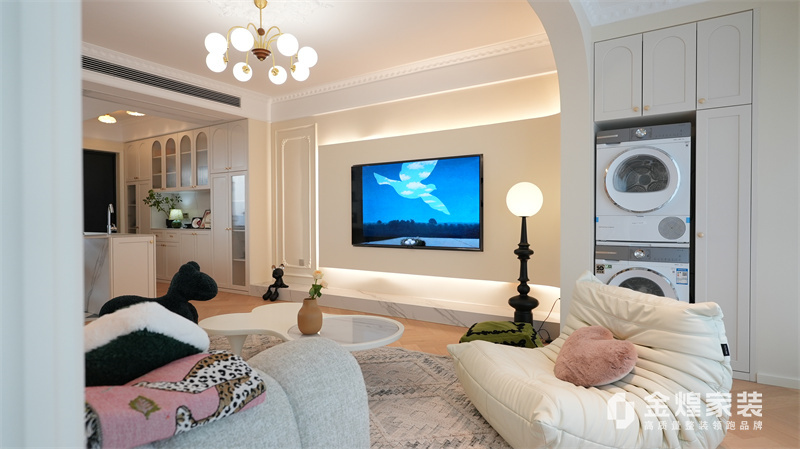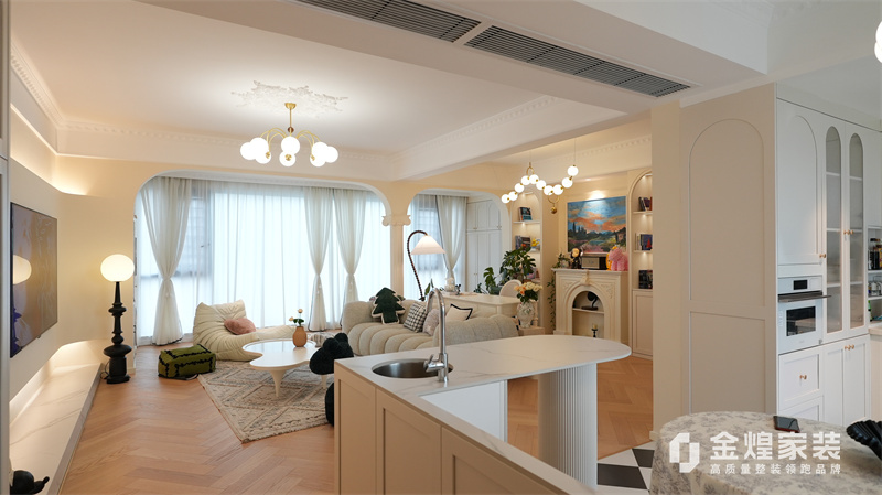 該案例整體色調柔和淡雅,家具造型簡約,線條流暢,同時融入了一些法式元素,如精致的吊燈、優(yōu)雅的拱形門洞和浪漫的裝飾細節(jié),既保留了法式風格的浪漫與優(yōu)雅,又兼具現(xiàn)代簡約的簡潔與實用。