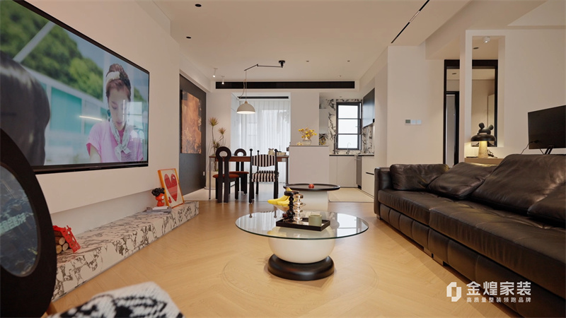 這套案例是現(xiàn)代中古混搭風(fēng)格。整體色調(diào)以淺色為主,搭配深色家具,營造出簡潔而不失溫馨的氛圍??蛷d的布局開闊,沙發(fā)、茶幾和電視的擺放合理,既美觀又實用。