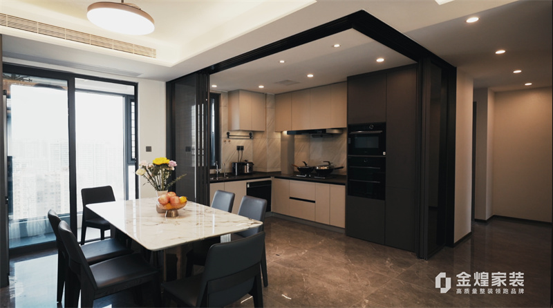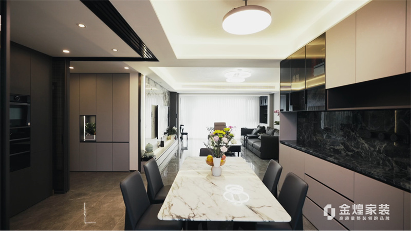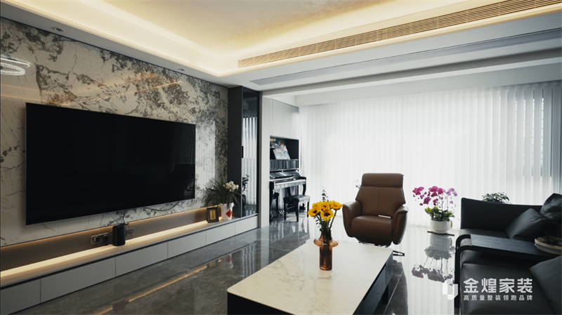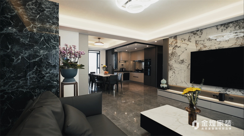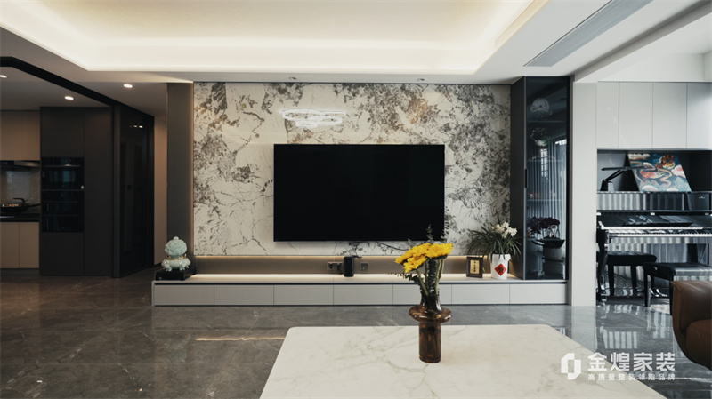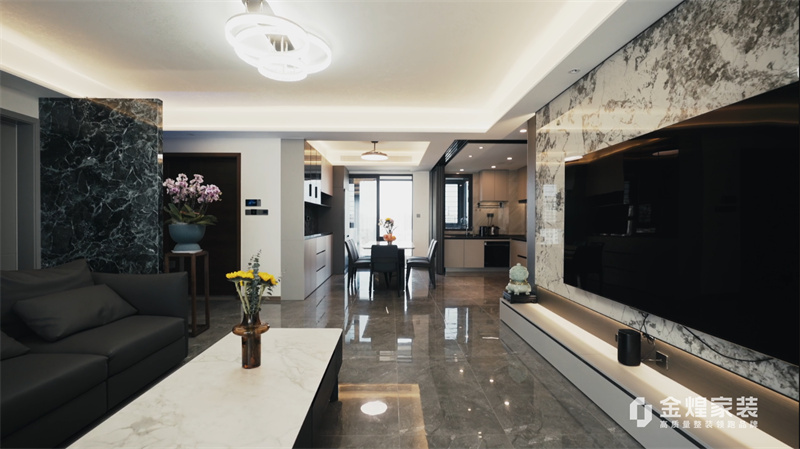電視背景墻的大理石紋理、簡潔的家具線條以及精心布置的燈光設(shè)計,都體現(xiàn)了現(xiàn)代輕奢風(fēng)格的特點。同時,通過添加一些鮮花和裝飾品,增加了空間的溫馨感和生活氣息。