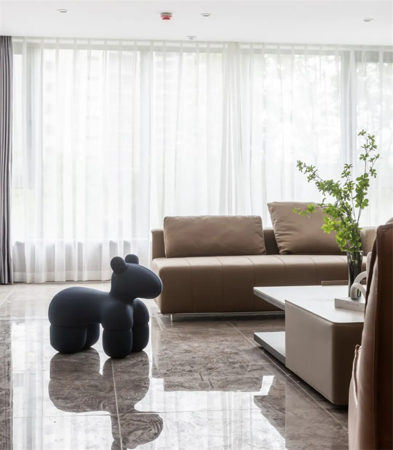 客廳擁有優(yōu)秀的采光條件,設(shè)計(jì)師選擇輕薄的窗簾布料,以確保陽光可以自由地灑進(jìn)室內(nèi),最大限度地引入自然光線。這樣的設(shè)計(jì)不僅增加了室內(nèi)的明亮度,還讓客廳與室外景色相融合,營造出一種開放和通透的感覺。