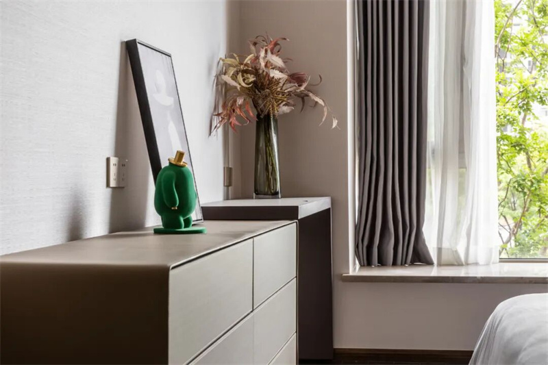 設(shè)計(jì)師在臥室中加入一些自然元素,擺放一些綠植花卉來增添一份生機(jī)和清新感。這些自然元素不僅能夠?yàn)榕P室?guī)硪环葑匀坏拿栏校€能讓人感受到大自然的寧靜和平靜。