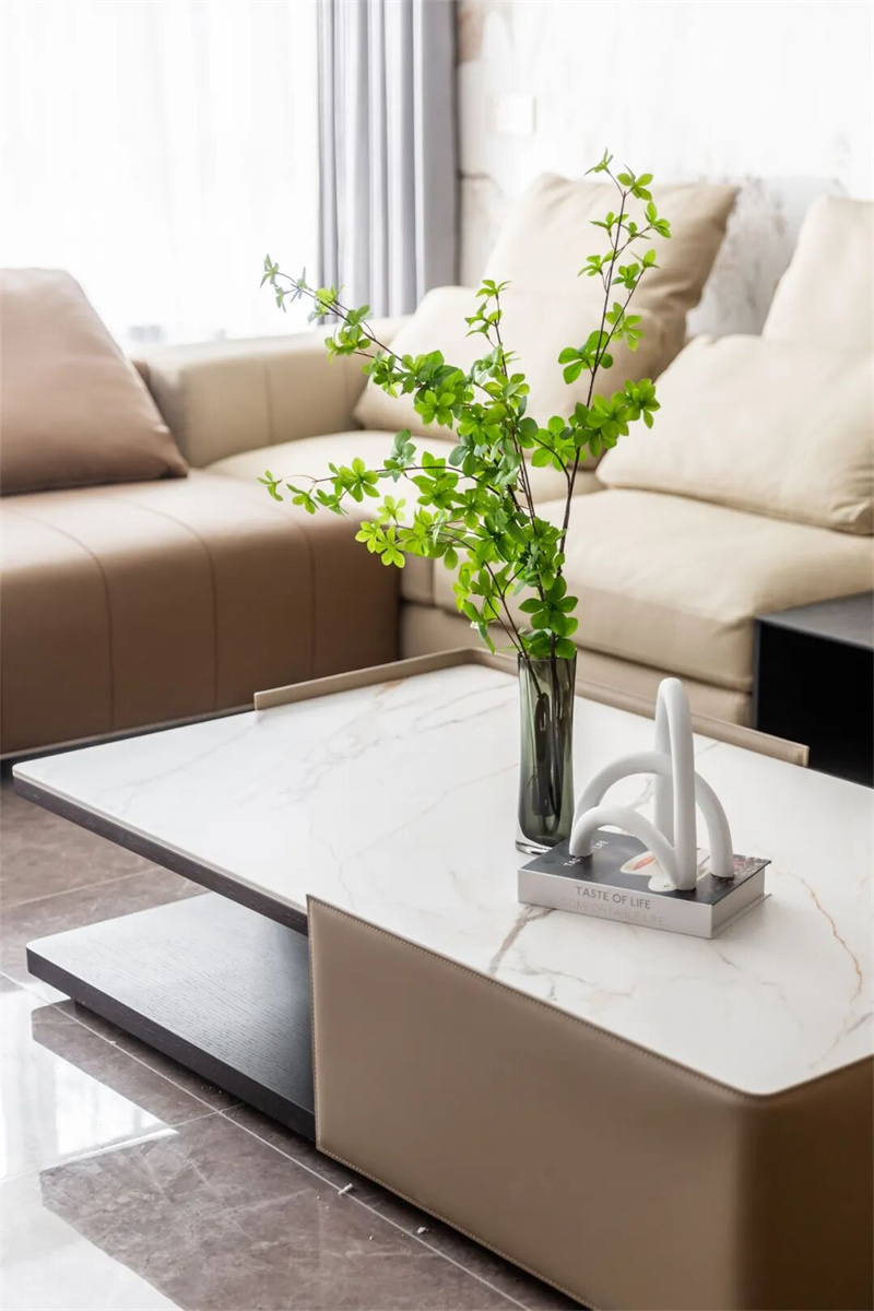 客廳的布局注重簡潔和流暢性,強(qiáng)調(diào)空間的整潔和無冗余的設(shè)計(jì)。一張舒適的糯白色沙發(fā),搭配白色頂面和咖啡色墻面,營造一個明亮而溫馨的空間。采用一些色彩明亮的軟裝和藝術(shù)品來裝飾,使整個空間更加生動有趣。