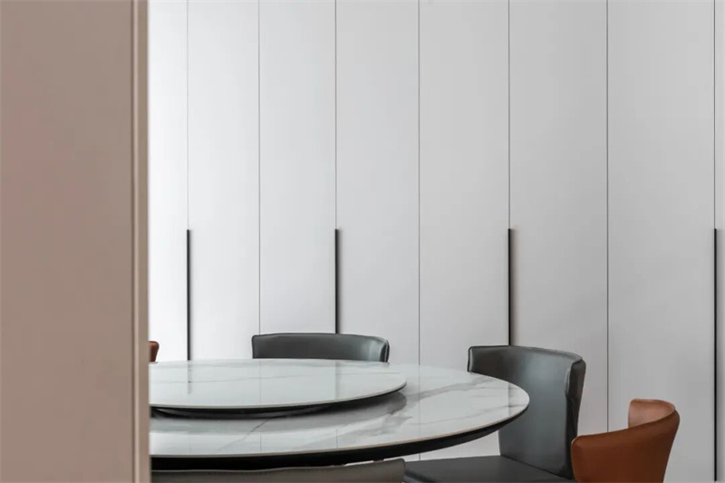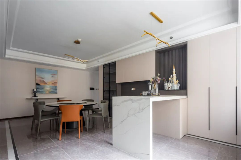 餐廳使用深色餐桌椅,搭配簡約而現(xiàn)代的餐具,以及柔和的暖色調(diào)燈光,這樣的布置使整個餐廳看起來簡潔而雅致,創(chuàng)造出一個優(yōu)雅而舒適的就餐環(huán)境,讓人沉浸在美食和交流的愉悅氛圍中。