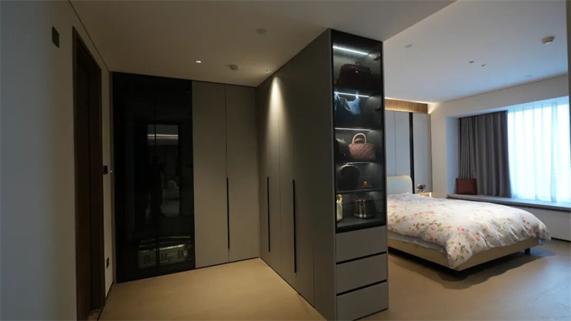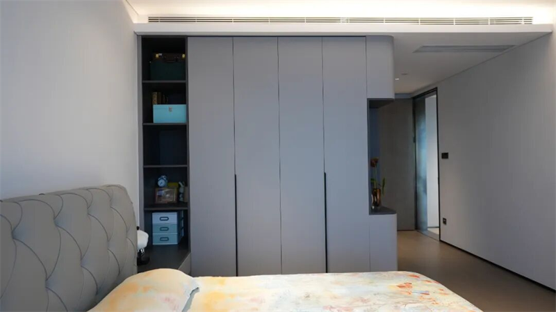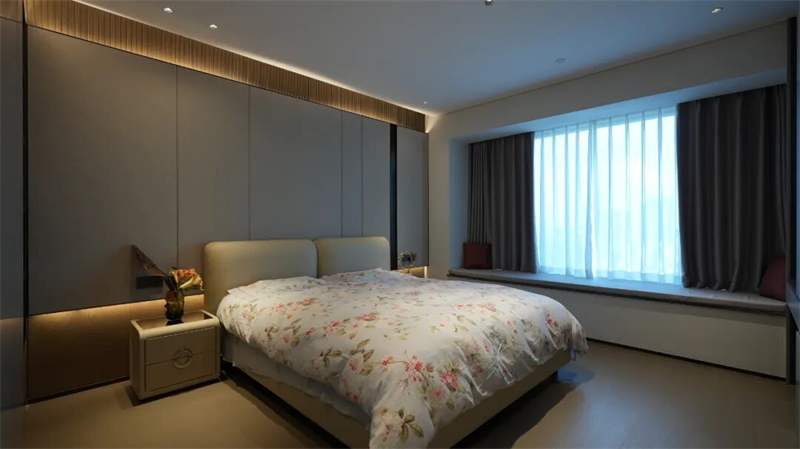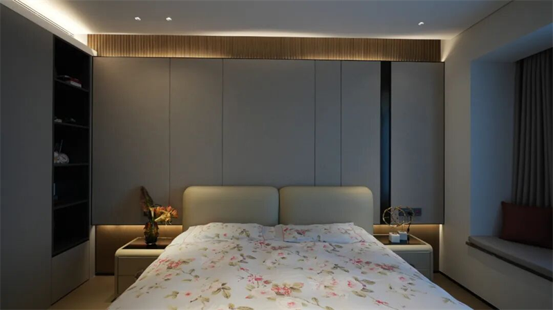 主臥整體色調(diào)沉穩(wěn)柔和,灰色軟包背景墻搭配木飾線條與隱藏式燈帶,營(yíng)造出靜謐而高級(jí)的睡眠氛圍。米色皮質(zhì)大床配花卉圖案床品,增添一抹自然柔美,讓空間更具溫度。一側(cè)開放式衣柜與嵌入式收納結(jié)合,滿足衣物與飾品的分類存放需求,兼顧美觀與實(shí)用性,打造一個(gè)整潔有序的私密空間。