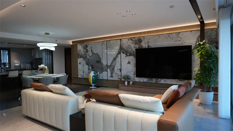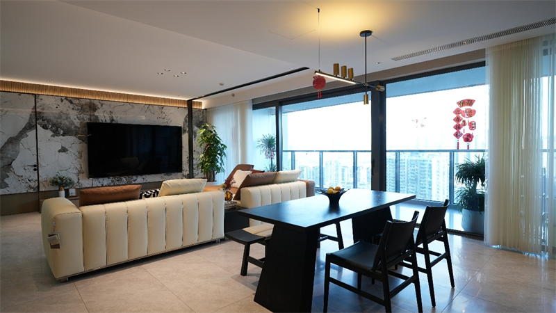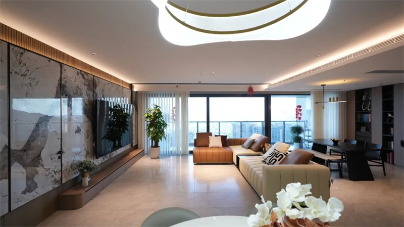 客廳,以開闊格局與精致細(xì)節(jié)彰顯品質(zhì)生活。大面積落地窗引入充足自然光,搭配通透紗簾,視野開闊,城市景觀盡收眼底。電視背景墻采用天然大理石紋理飾面,結(jié)合木飾線條勾勒,層次豐富又不失高級(jí)感。