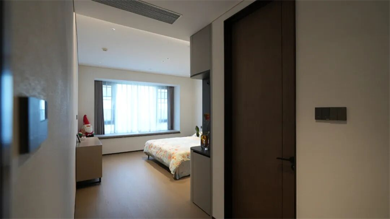 次臥以簡(jiǎn)約現(xiàn)代風(fēng)格為主,整體色調(diào)柔和寧?kù)o,淺灰墻面搭配原木色地板,營(yíng)造出舒適放松的睡眠氛圍。一側(cè)定制整墻衣柜,兼具收納與展示功能,柜體線條簡(jiǎn)潔,與墻面自然融合,提升空間整潔度。大窗戶配紗簾與遮光簾,采光充足且私密性良好,為日常起居提供明亮舒適的環(huán)境。