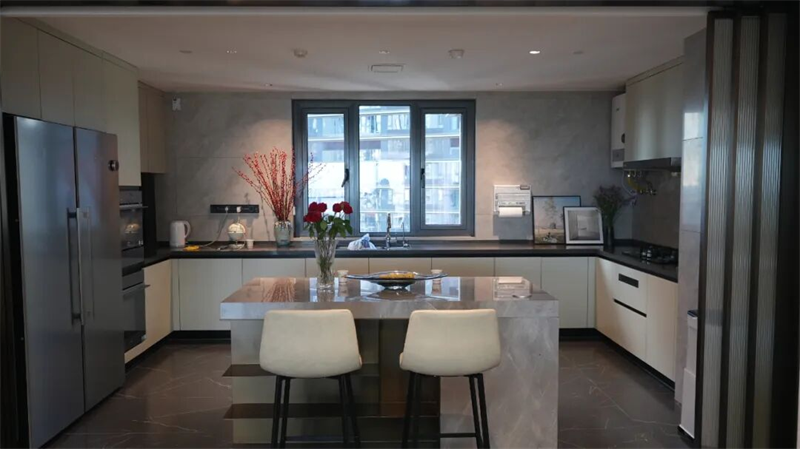 廚房淺色櫥柜搭配黑色臺(tái)面與灰色墻面,營(yíng)造出干凈利落的視覺效果。中央島臺(tái)采用大理石材質(zhì),兼具操作臺(tái)與吧臺(tái)功能。嵌入式冰箱、烤箱與洗碗機(jī)等高端家電一應(yīng)俱全,布局合理,提升使用效率。綠植與花藝點(diǎn)綴其間,為空間增添生活氣息,讓下廚也成為一種享受。