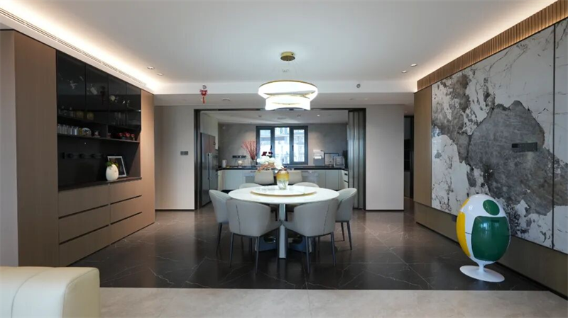 餐廳延續(xù)整體現(xiàn)代輕奢風(fēng)格,圓形大理石餐桌搭配淺色皮質(zhì)餐椅,簡(jiǎn)潔大氣又不失溫馨。地面采用深色大理石瓷磚,與淺色墻面形成對(duì)比,提升空間層次感。一側(cè)整墻儲(chǔ)物柜兼具酒柜與展示功能,玻璃門設(shè)計(jì)讓藏品一目了然,實(shí)用又美觀。