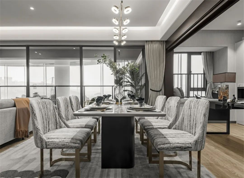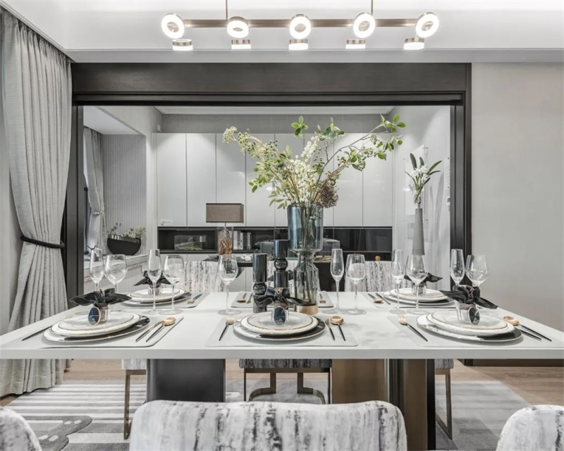 餐廳延續(xù)了客廳的風(fēng)格,餐邊柜將定制柜的美觀與實(shí)用性發(fā)揮得淋漓盡致?,F(xiàn)代感十足的燈具將溫暖的光線投射到大理石餐桌和布藝餐椅上,營造出舒適的用餐氛圍。
