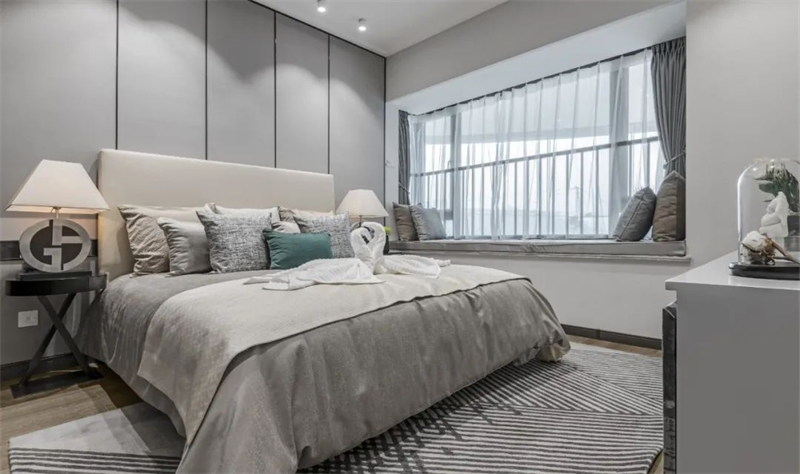 臥室精心挑選了高品質(zhì)的床具,柔和舒緩的色調(diào)給人寧靜的感覺。搭配柔軟舒適的床品和軟裝,保證了睡眠質(zhì)量。同時(shí),考慮到大空間的照明需求,臥室布置的燈具都以溫柔的意象為主題,為空間營造了貼心的守護(hù)感。