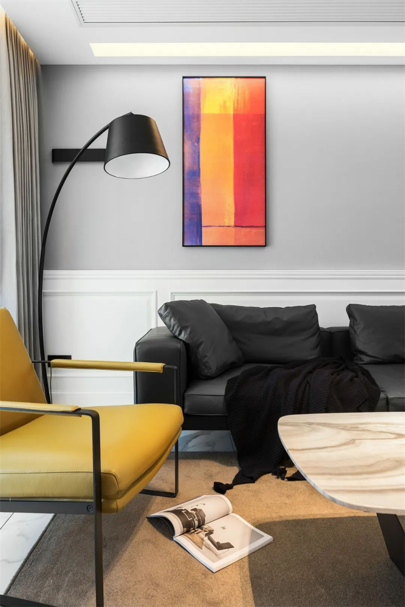 客廳主色調(diào)采用灰白墻面與白色大理石地磚搭配,創(chuàng)造出通透明亮的空間感。低調(diào)的深色調(diào)沙發(fā)展現(xiàn)簡(jiǎn)約品味。通過(guò)一些精致的極簡(jiǎn)設(shè)計(jì)裝飾畫(huà)和空間擺件,為整個(gè)客廳注入一絲藝術(shù)氛圍。