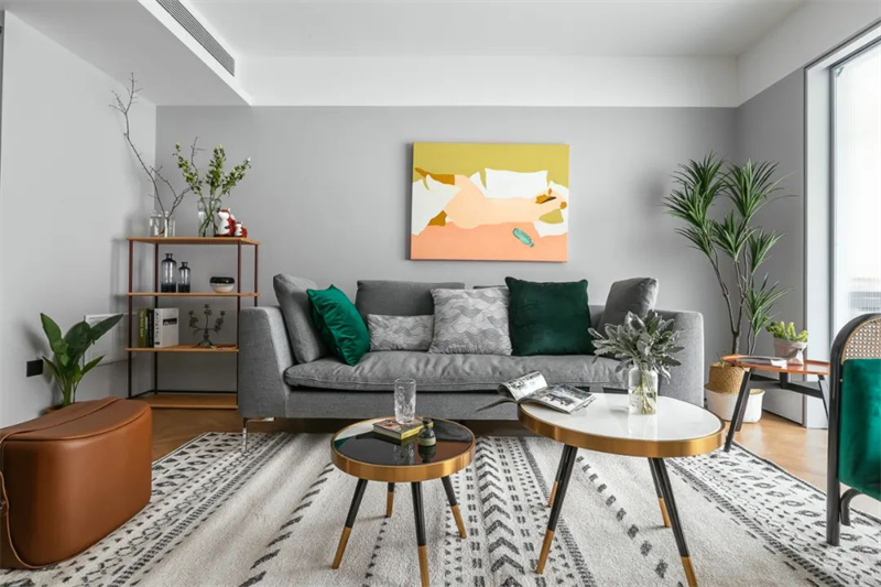 客廳灰白色墻壁和原木色的地板營造出寬敞、明亮的氛圍。大型的落地窗引入大量光線,讓人感覺仿佛置身于大自然中。一張灰色的沙發(fā)搭配著舒適的抱枕,提供了家人和朋友聚集的理想場所。加上豐富且漂亮的綠植點(diǎn)綴,讓空間充滿舒適的自然氣息。