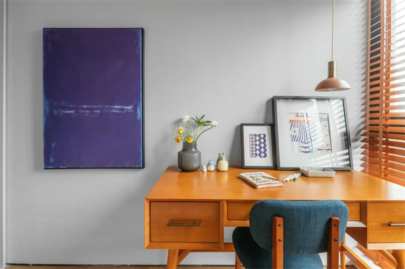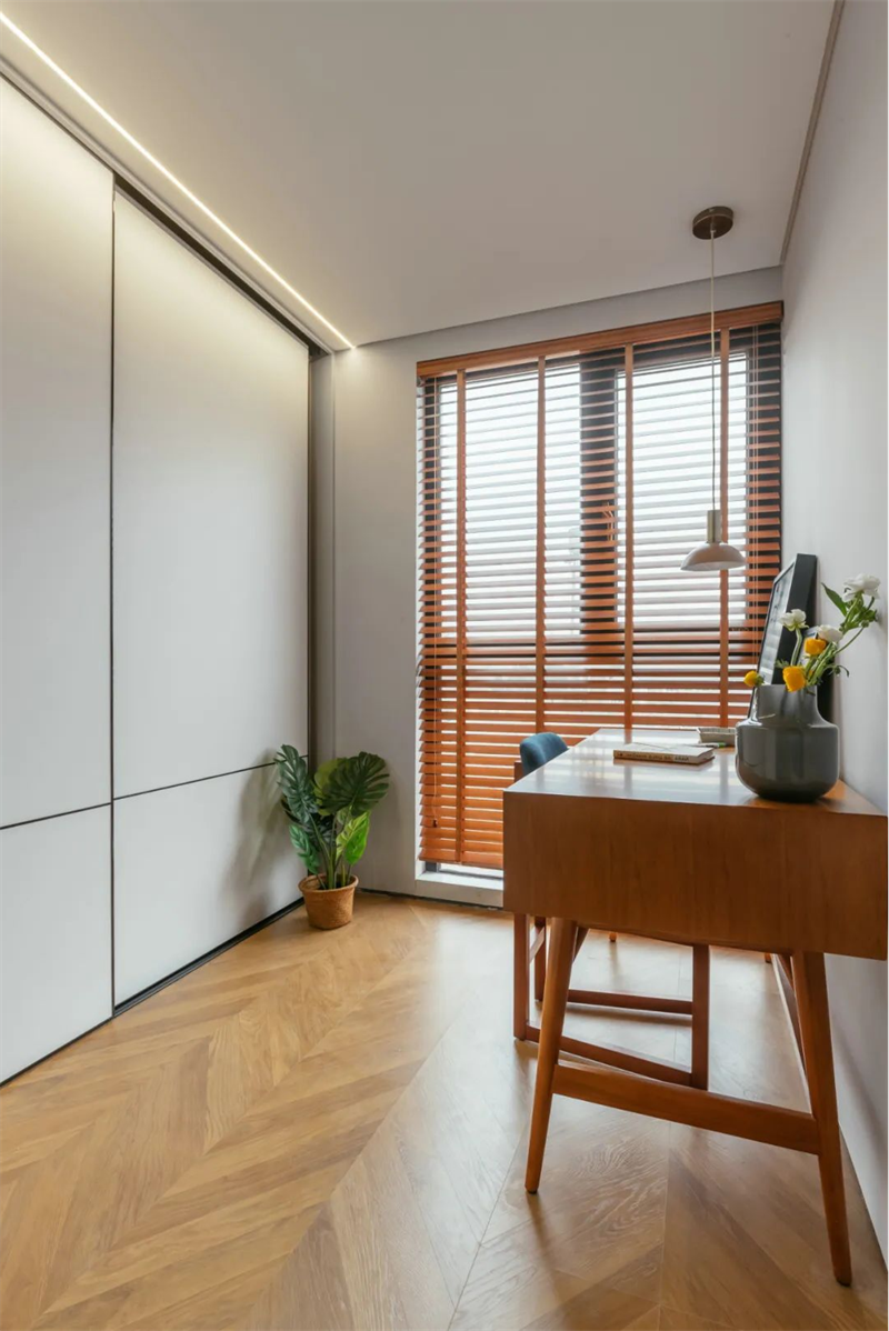 書房處于一個溫馨的角落,充滿了閱讀和學(xué)習(xí)氛圍。書桌選用一張簡約的原木桌子,搭配舒適的布藝椅子適合長時間坐靠工作和學(xué)習(xí),打造適合靜心思考和深度閱讀的理想場所。